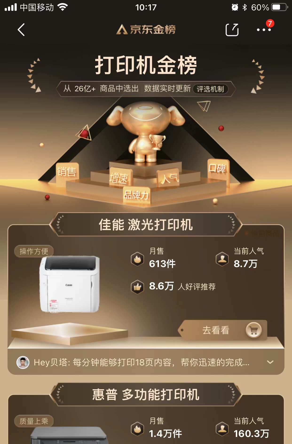 其实这款打印机的真的不是吹的,京东的打印机金牌一直是稳居第一。